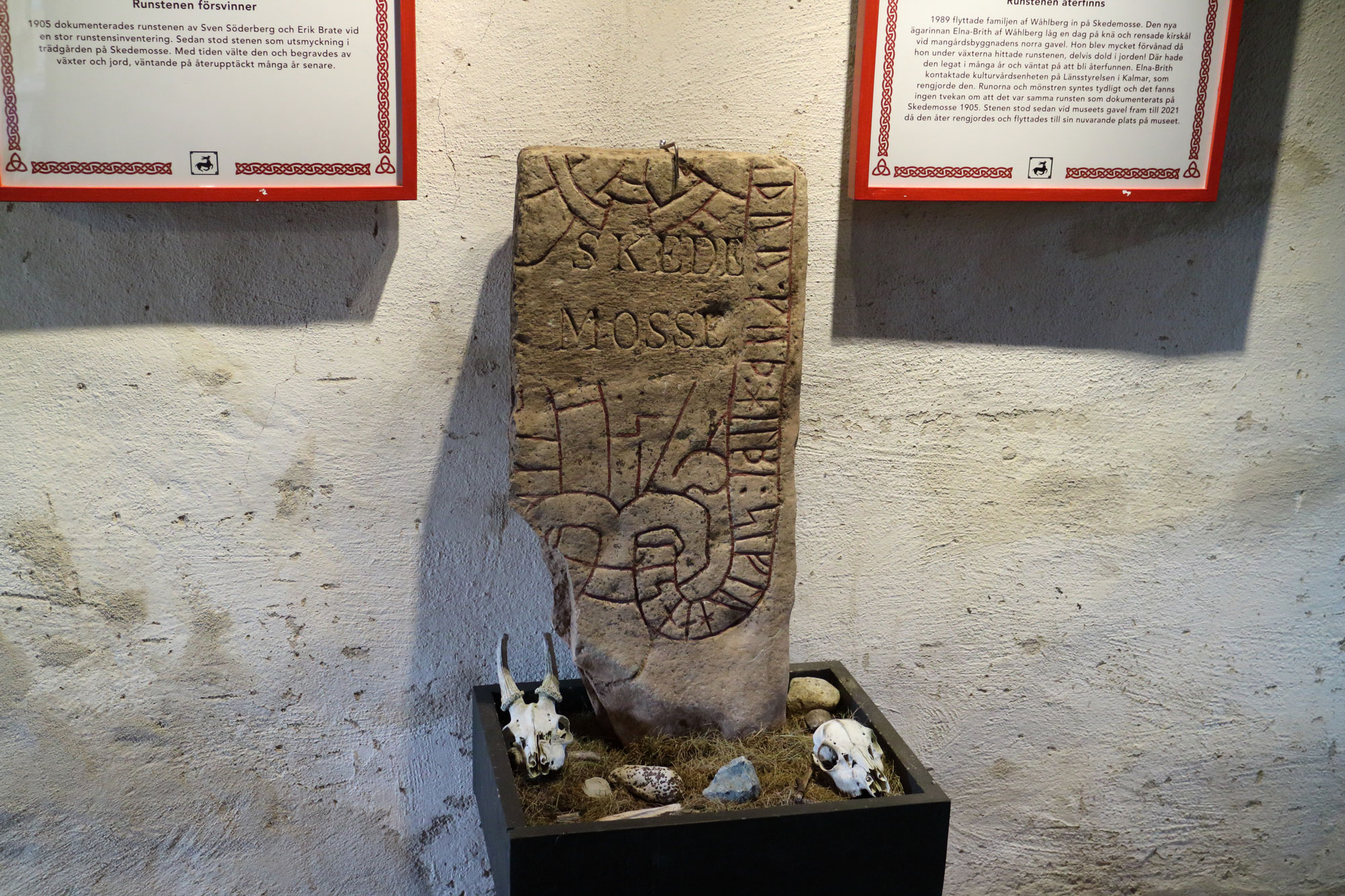 En dag 1989 när Elna-Brith af Wahlberg, ägare till Skedemosse, låg på knä och rensade kirskål vid mangårdsbyggnadens norra gavel blev hon mycket förvånad då hon under växterna hittade en runsten delvis dold i jorden. Där hade den legat i många år och väntat på att bli återfunnen. Elna-Brith kontaktade kulturvårdsenheten på Länsstyrelsen i Kalmar, som rengjorde stenen. Runstenen hade dokumenterats på Skedemosse 1905 men sedan försvunnit.