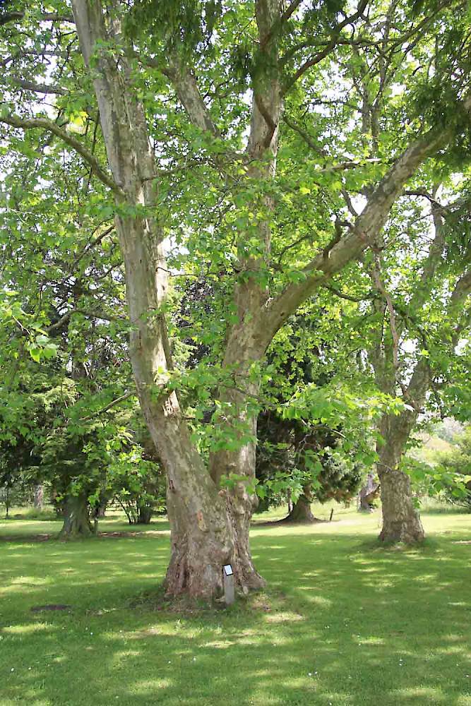 Platan (Platanus acerifolia). Två jätteträd står till höger i parken. De planterades 1895. Härstammar från Sydeuropa/Asien.